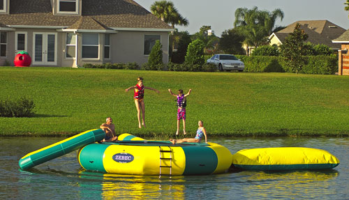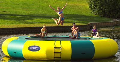 Zebec Water Trampolines are unique. Our standard models are 17′ and 22′ in diameter (2′ larger than competitive models) to give you more room for enjoyment. This extra 2 feet provides a much larger jumping surface and makes a tremendous difference when jumping. Trampolines are made with heavier material, heavier frames, a larger jump surface, longer ladders, more springs, more anchor points, more handholds, more frame holders, etc… The heavy-duty construction and extra features provide a greater value for your money.
